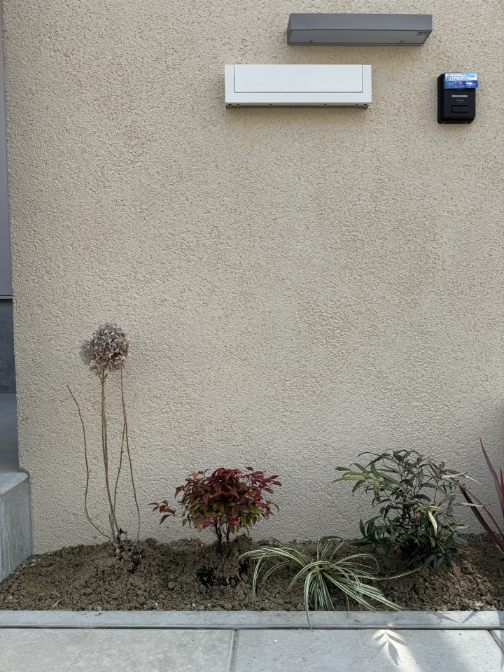 玄関前のちょっとしたスペースに4つ、5つの植栽が植わっていました。