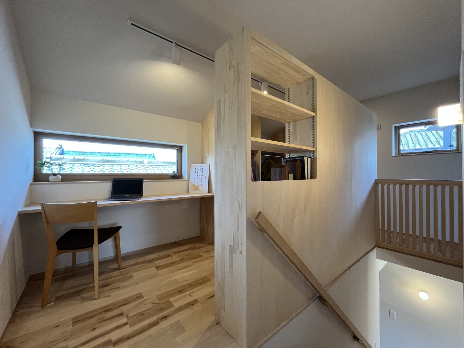 12段の階段をあがるとそこには2人は裕に座れるスタディカウンターや背面の本棚、WICの棚など