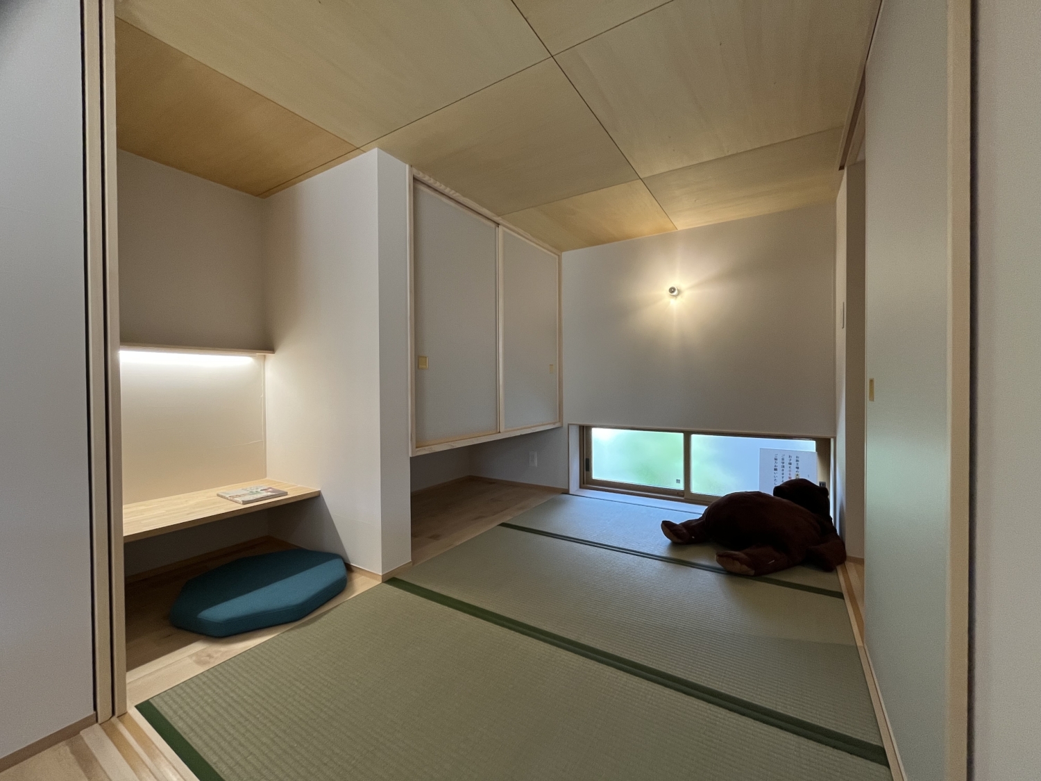 LDKの隣りには小上がり和室3帖をつくり、将来ここでも寝られるように押入は足元を浮かせたのと