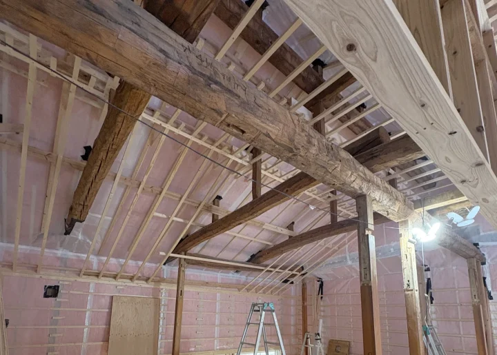 今回のリノベーションでは、その丸太梁をあえて見せるかたちにし、
