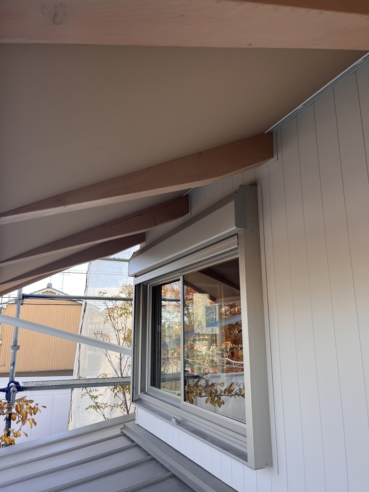 ベージュっぽい軒天に、あらわしている登り梁も淡い色で塗装しました。
