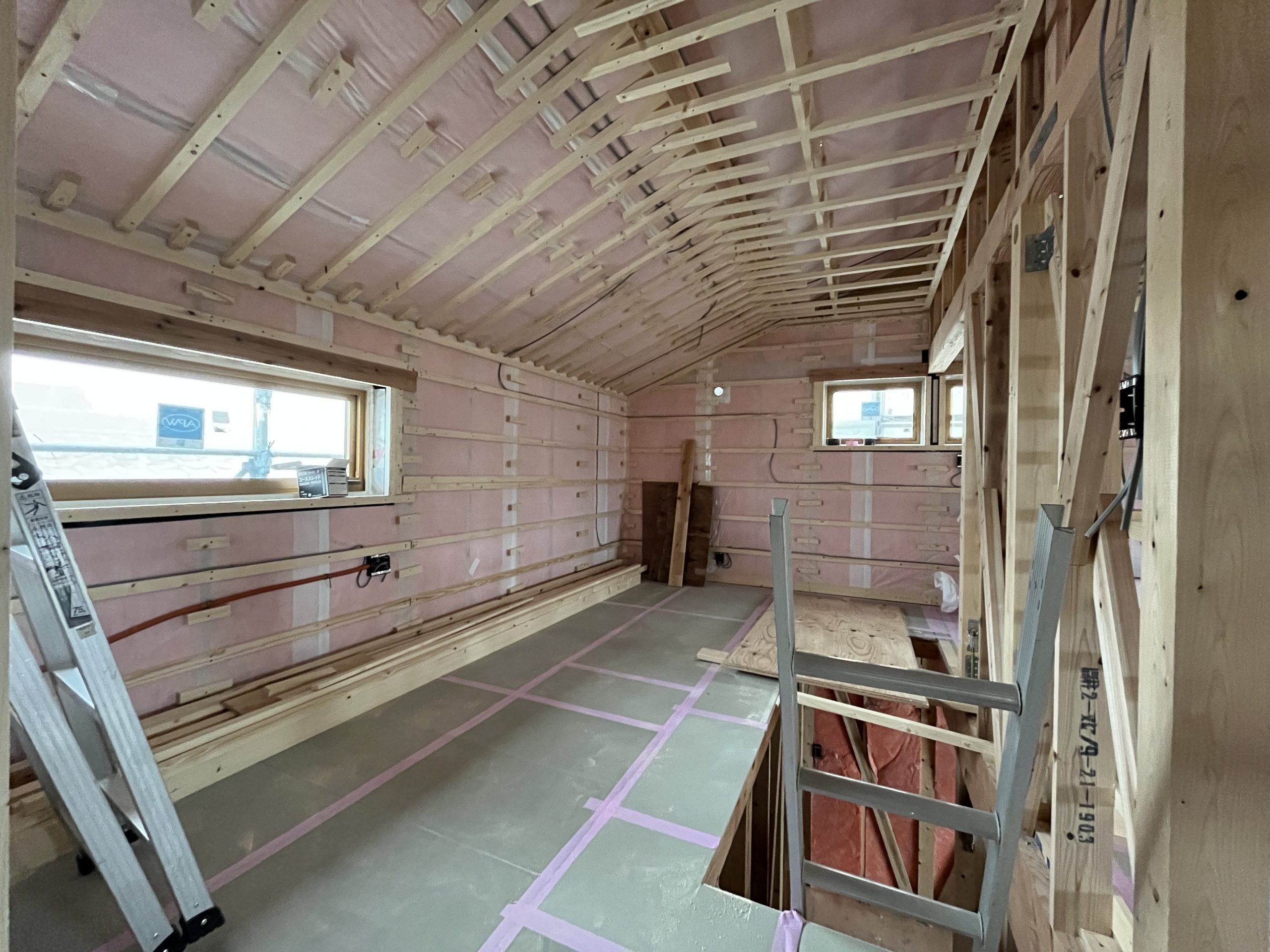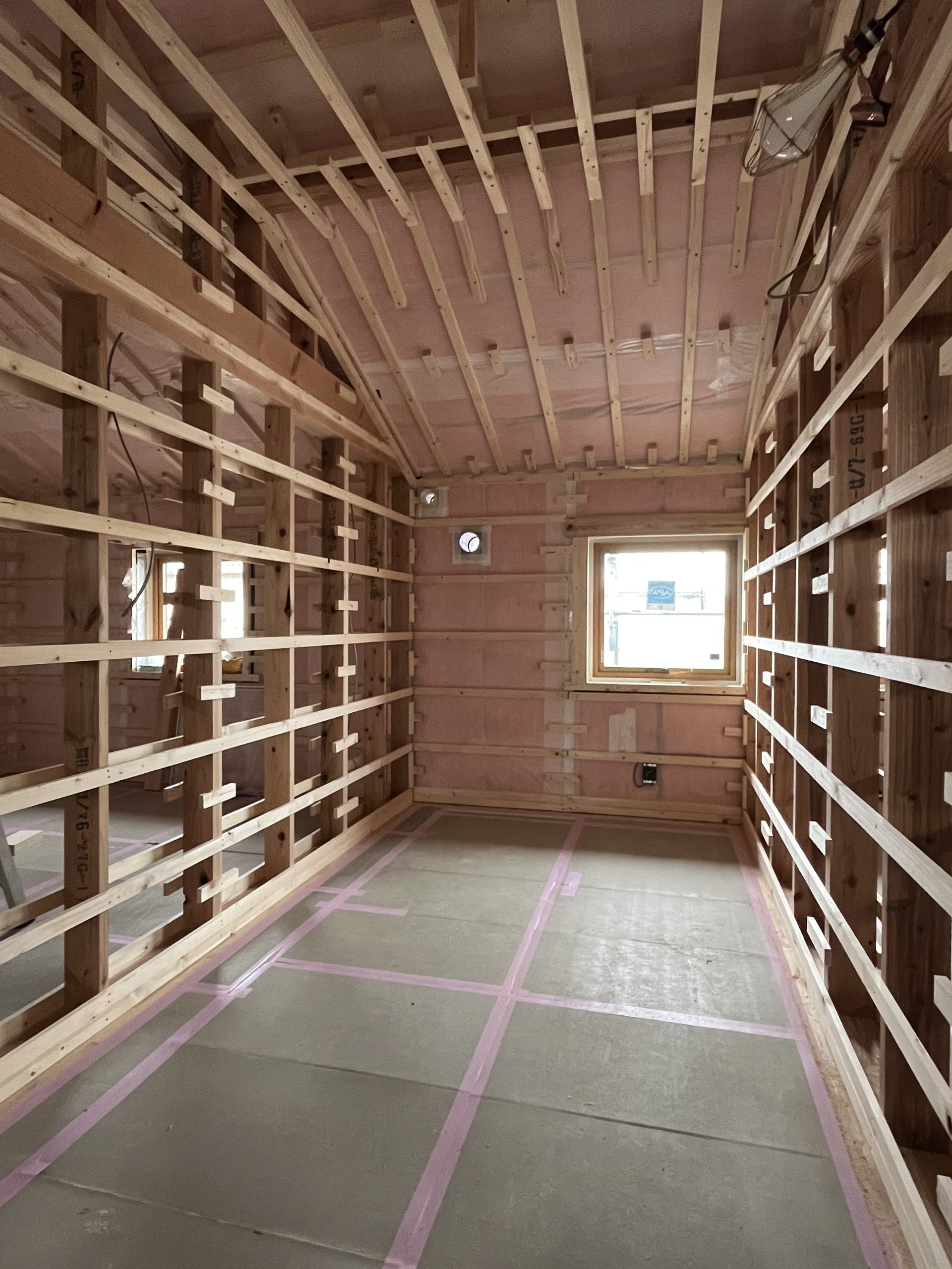 まだ壁の石膏ボードを貼る前ですから なんだか木がいっぱい、縦横無尽に流れています。