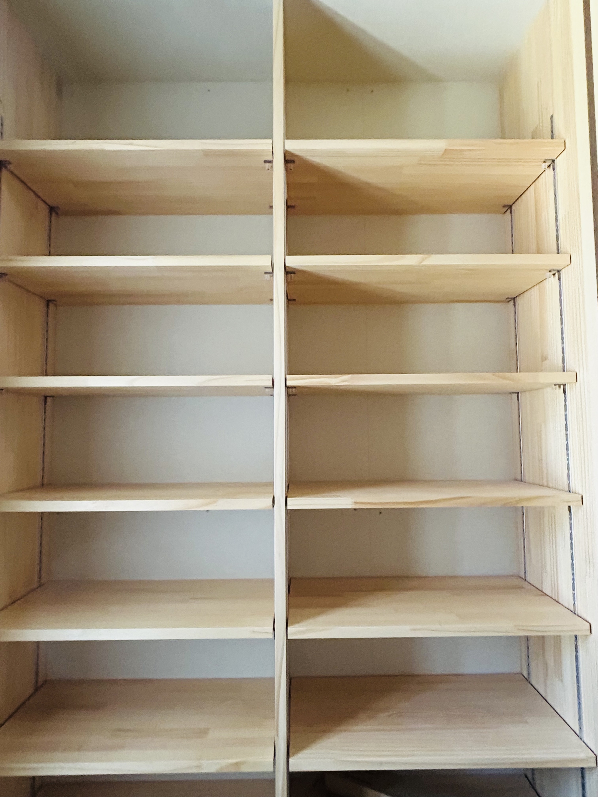 納戸の固定棚は、大小の荷物を自由自在に収納するスペースで、