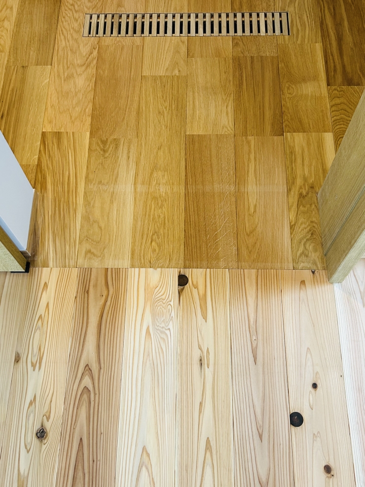 床の施工も、部屋毎の縁の切れ目の箇所は、違和感を感じ無い様に、目地位置を揃えて施工してあり、
