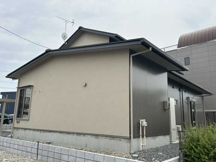 外壁が、南東と北西で貼り分けられていて、南東は塗り壁仕上げ、北西はガルバリウム鋼板仕上げとなっていて、