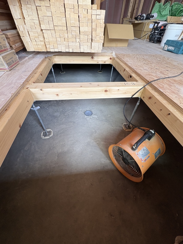 床の剛床が開放されている部分には、基礎コンクリートを乾かすために設置されている