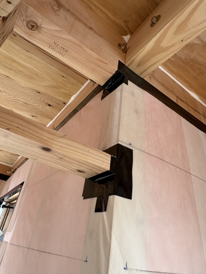 柱、梁部分には、空気を通さない様に気密テープが隙間なく施されていて、