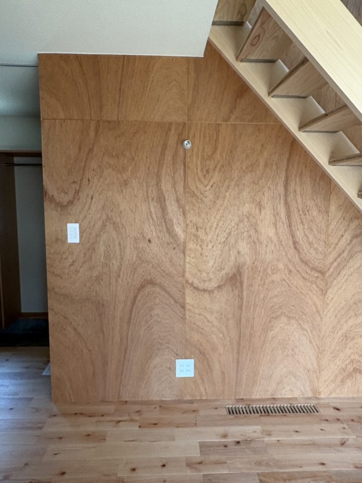 キッチン廻りは、ラワン合板で仕上がっていて、キッチン棚のバランス、パントリーの出入口がR形状でアクセントになっていました。