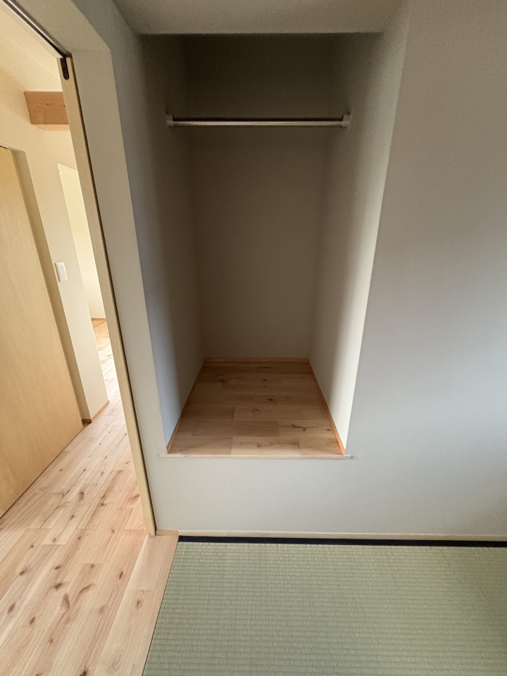 出入口付近には、奥行きのあるパイプハンガー付きのオープン収納があり、使い勝手がよさそうです。