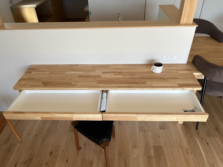 造作カウンターは、天板が木の集成材でナチュラルな雰囲気があり、フローリング、他の家具と