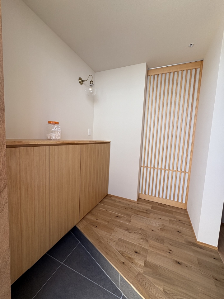 玄関も、木の格子戸が和モダンな雰囲気を演出していて、温かみがあり