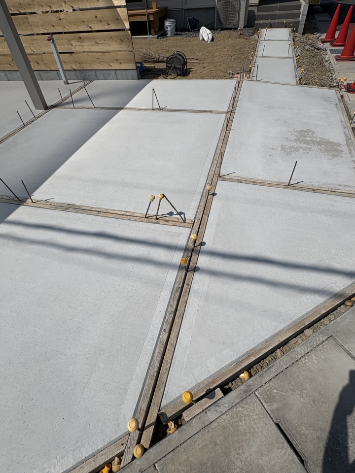駐車スペースのコンクリート打設では、打設部分に木の型枠が施工されていて、