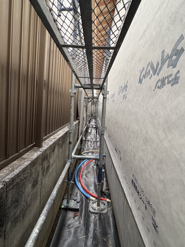 隣地と建物との間が狭いながらも、単管足場のベース、単管支柱、作業床が頑丈に施工されていて、