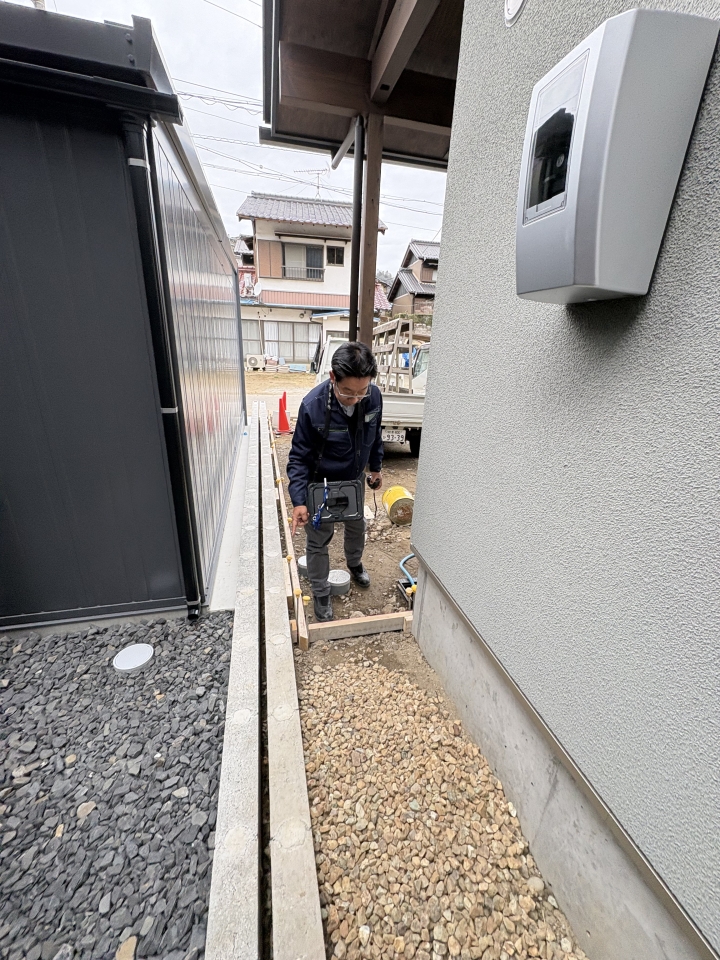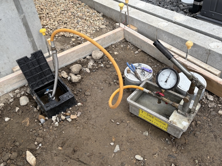 S様邸、水道設備業者が、敷地内の水道圧力の測定をしていました。