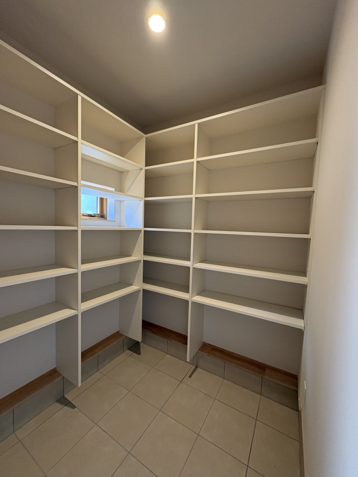 U様邸、パントリー内の収納棚が可動式でスペースが広いので、開放的な感じでした。