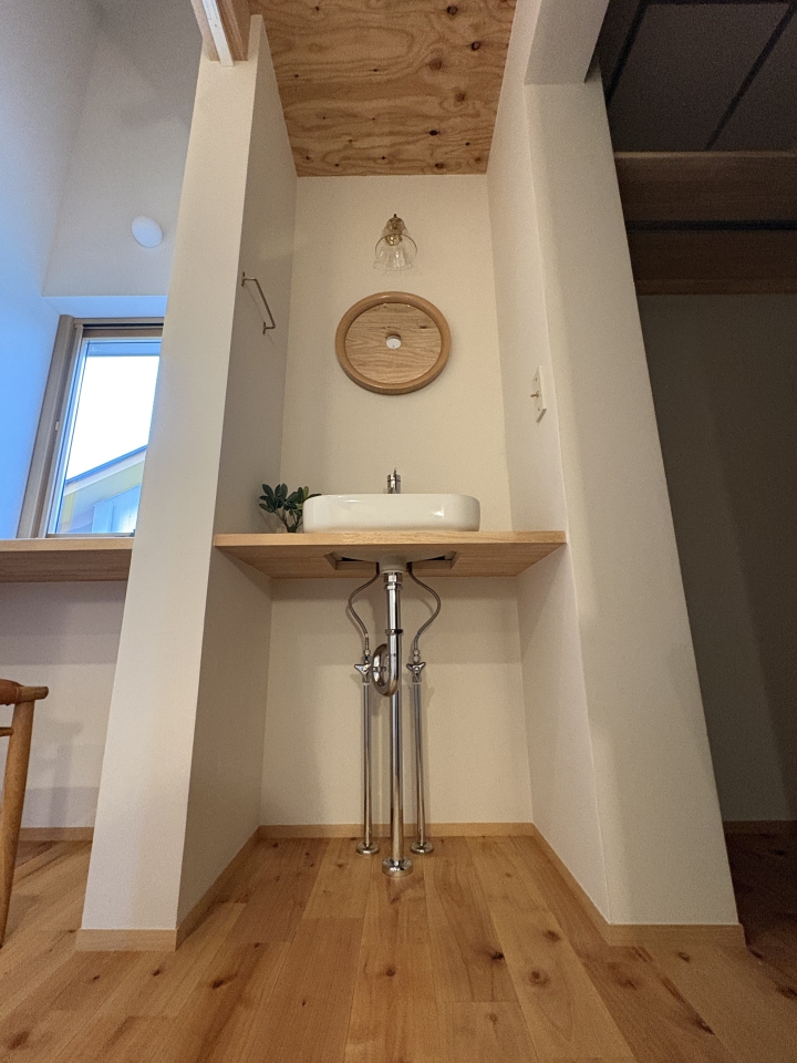 S様邸、階段を上がった2Fホールの真正面に、造作手洗いが設置してありました。