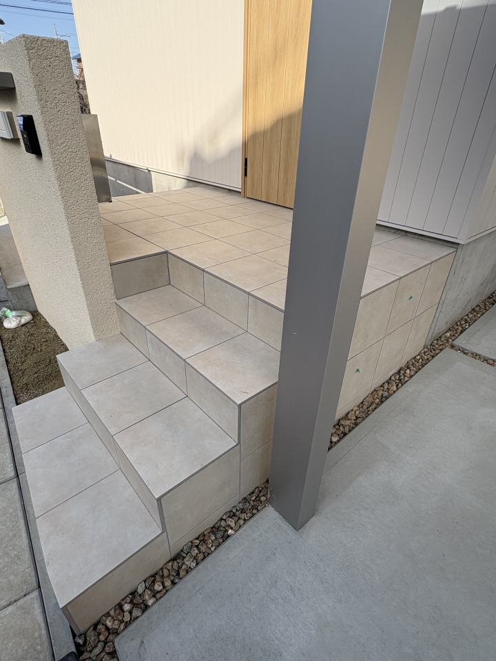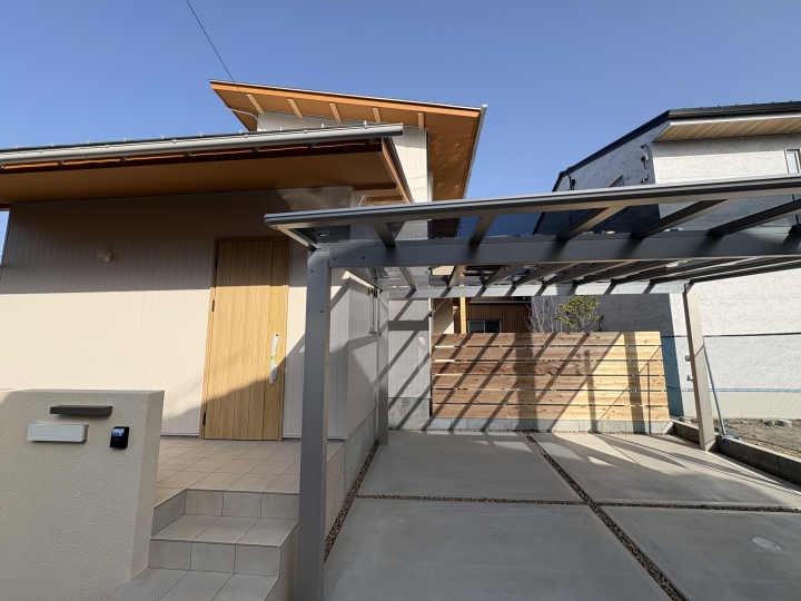 玄関ポーチ、カーポート支柱、駐車場の土間コンクリートの取合いが調整されていて、違和感なく設置されていました。