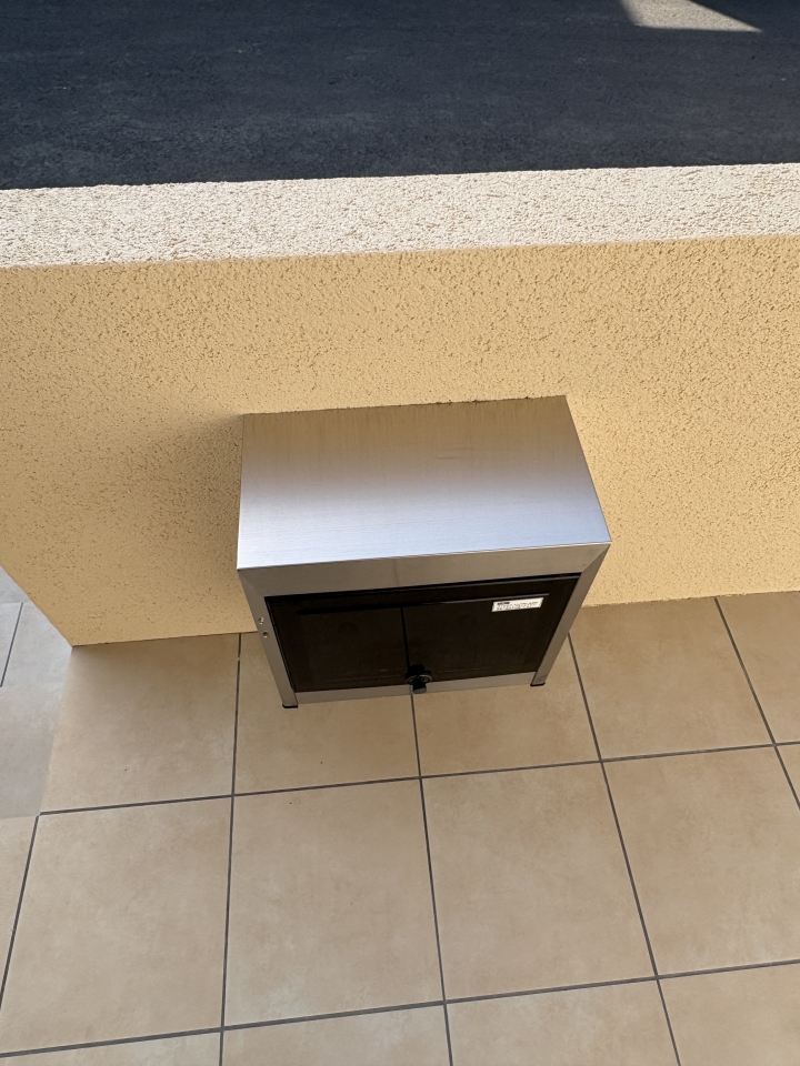 外へ出ると、カーポート、木フェンスが施工されていて、大容量のポストも壁付けで設置されていました。