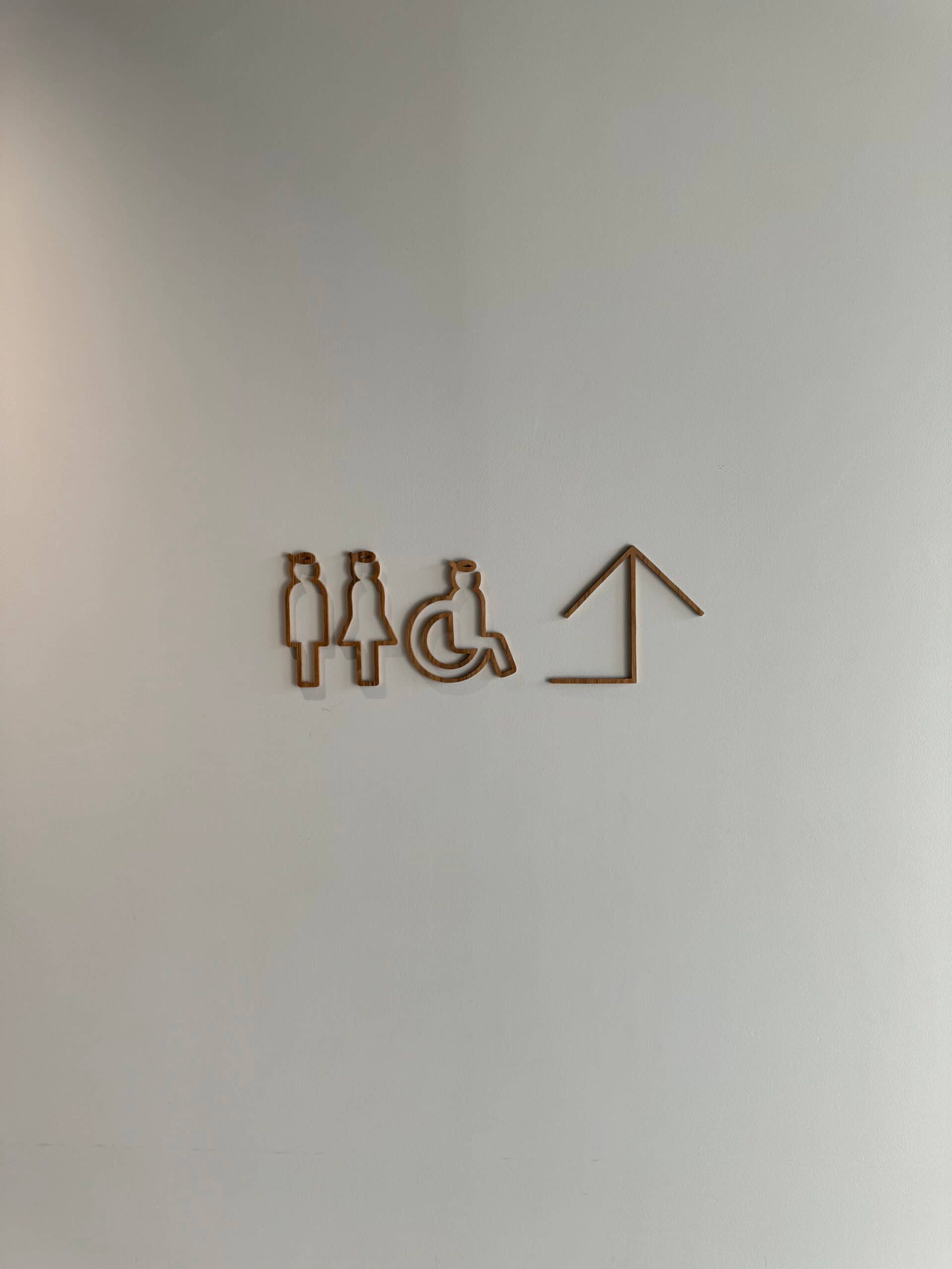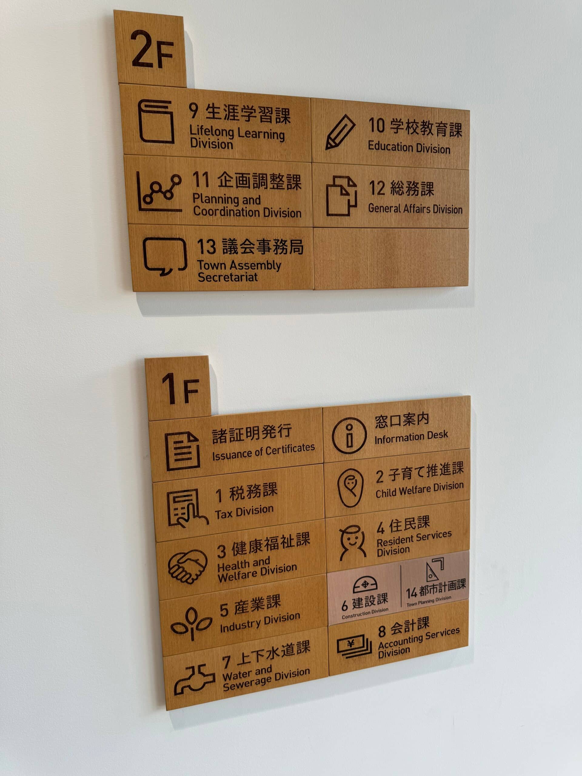 トイレのピクトグラムや案内板も木で作られていて、内観との統一感がありました。