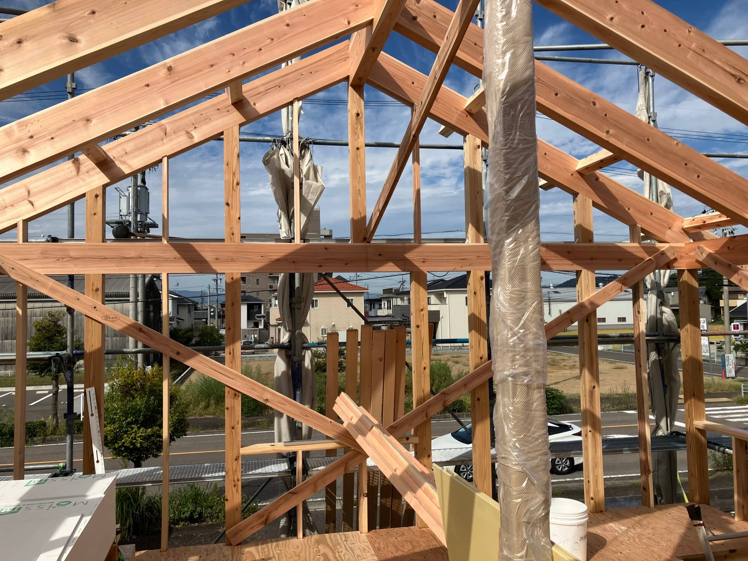 上棟日当日の様子のため、まだ屋根や窓が入っていない状態の写真を撮ることができました。