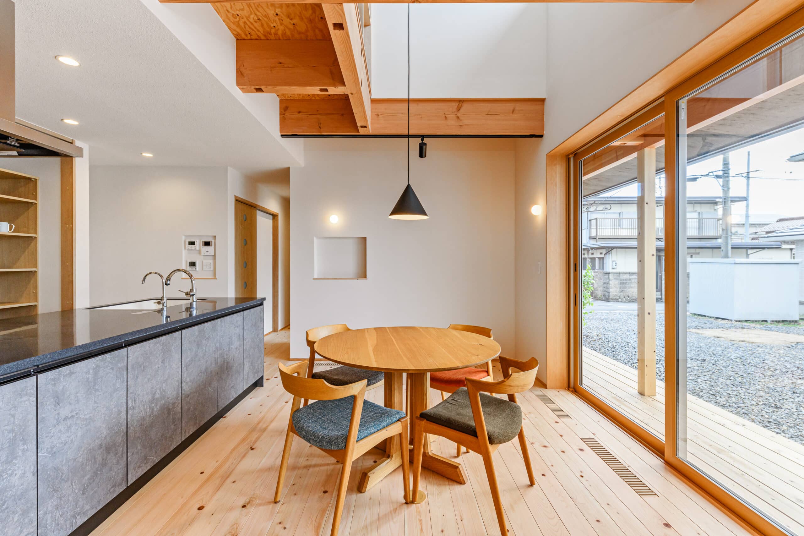 ヒノキのフロアとホワイト系の塗り壁、化粧で見せた梁など