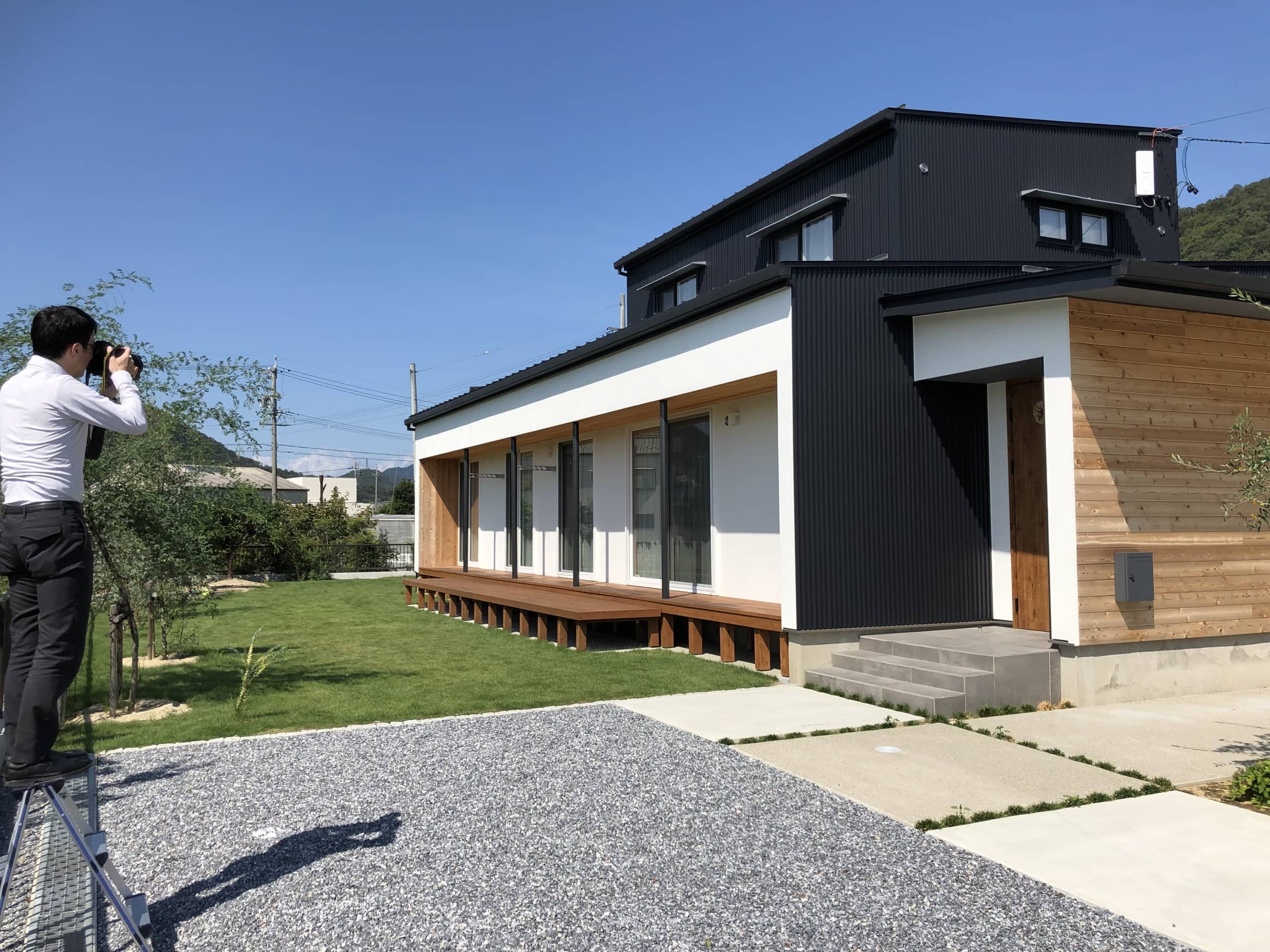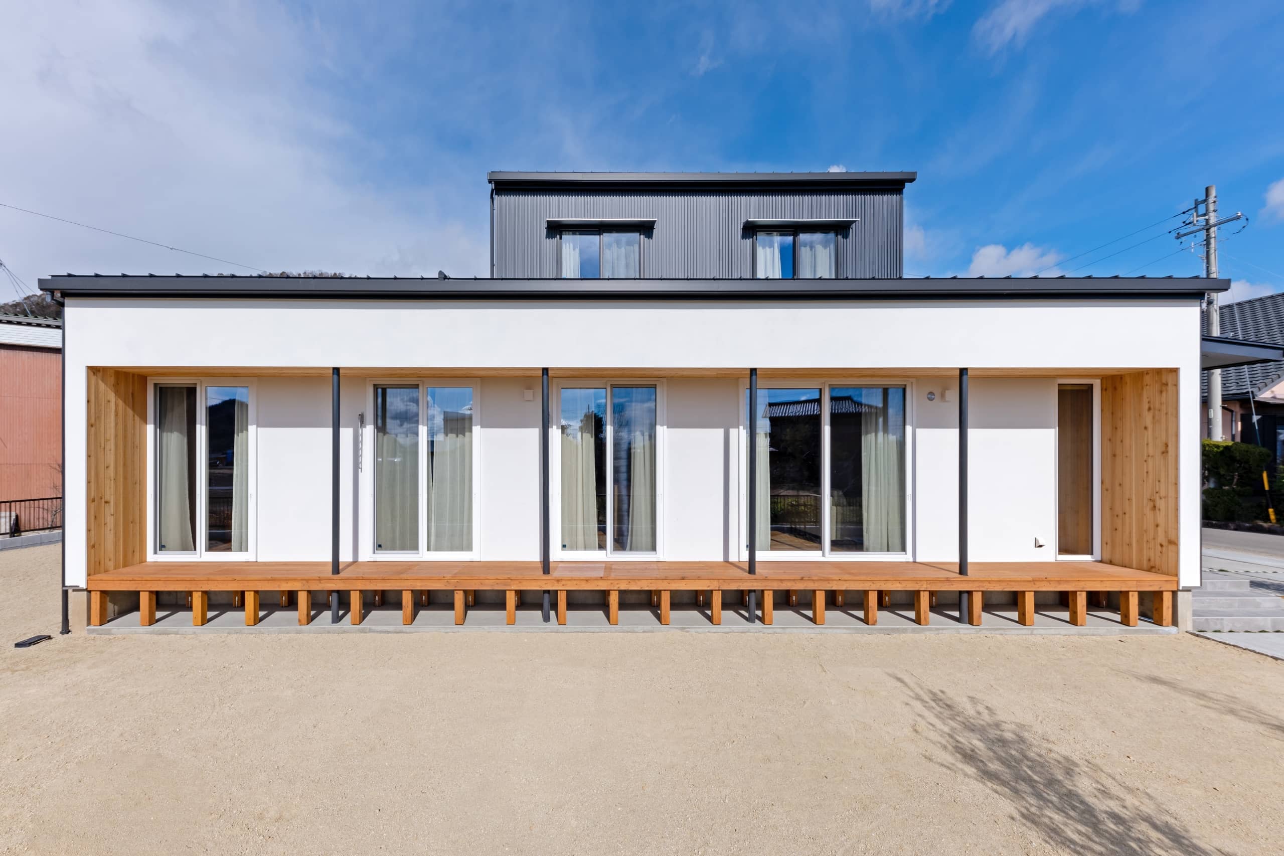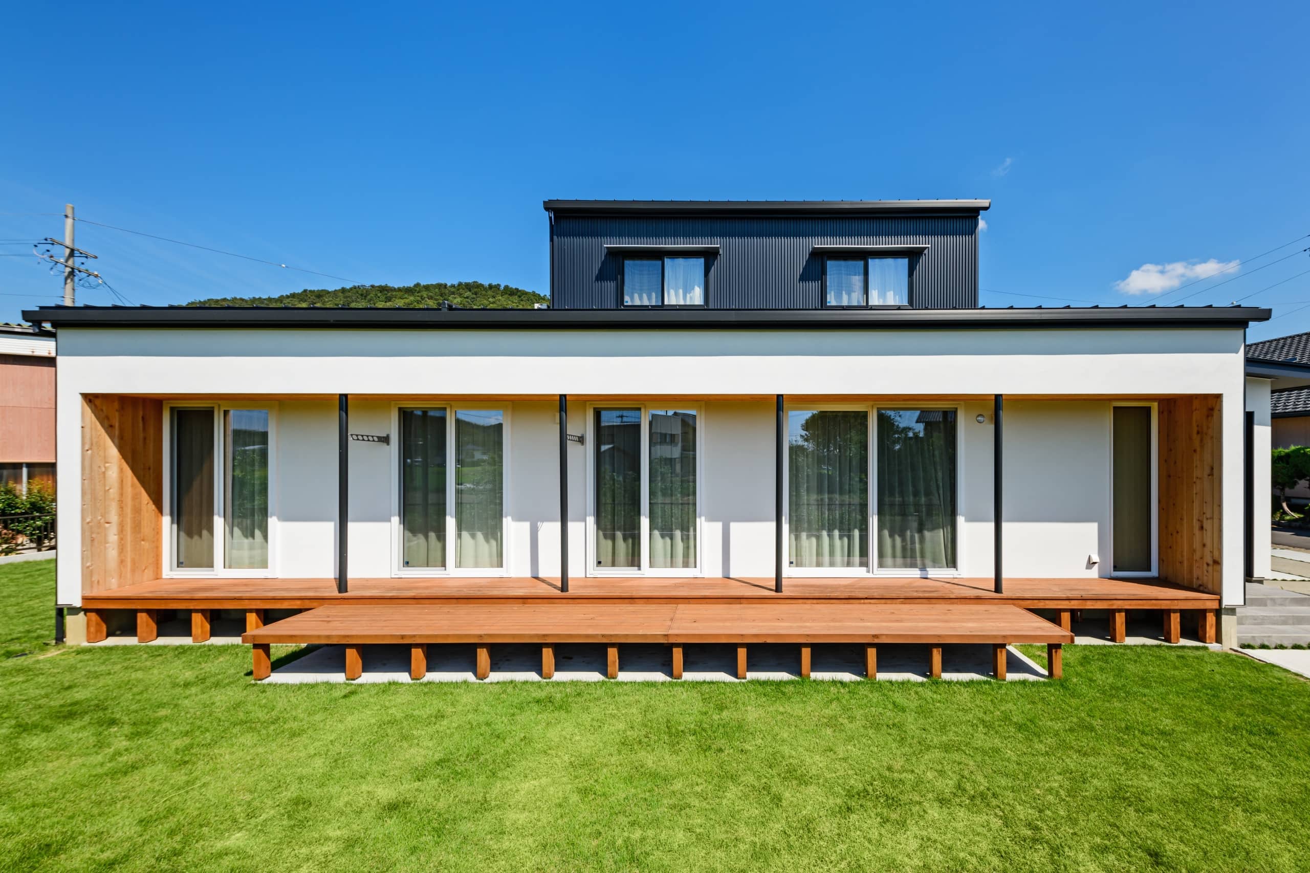 青空にミドリの芝生、黒ガルバと板貼りのコントラストが最高です!