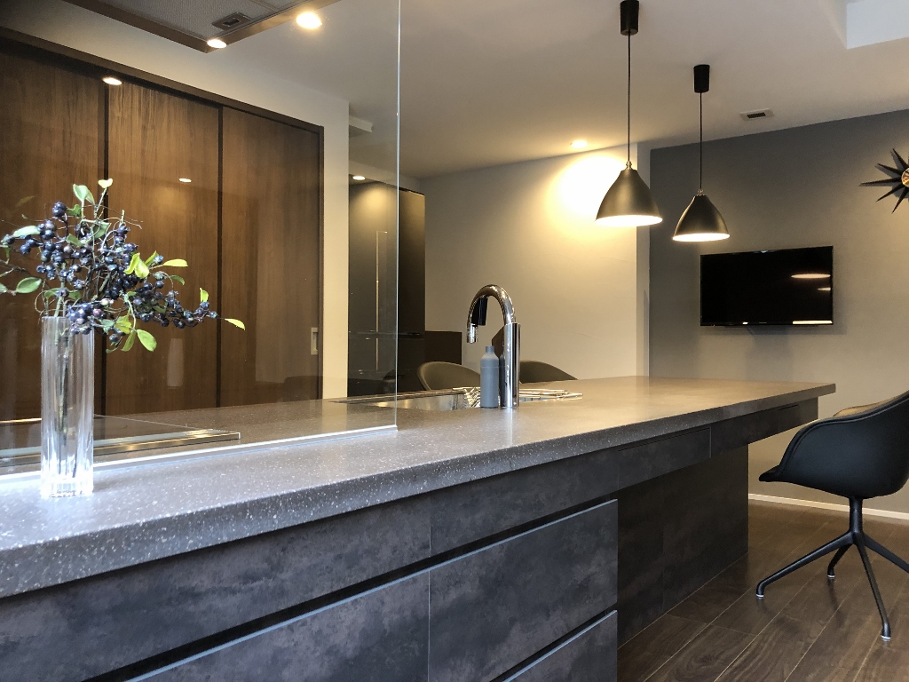 奥さまこだわりのキッチン、やっぱりカッコよかったです、この色あいが内装とよく合っています。