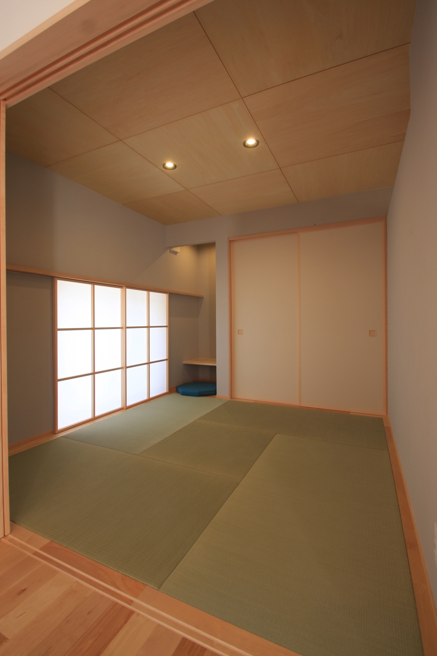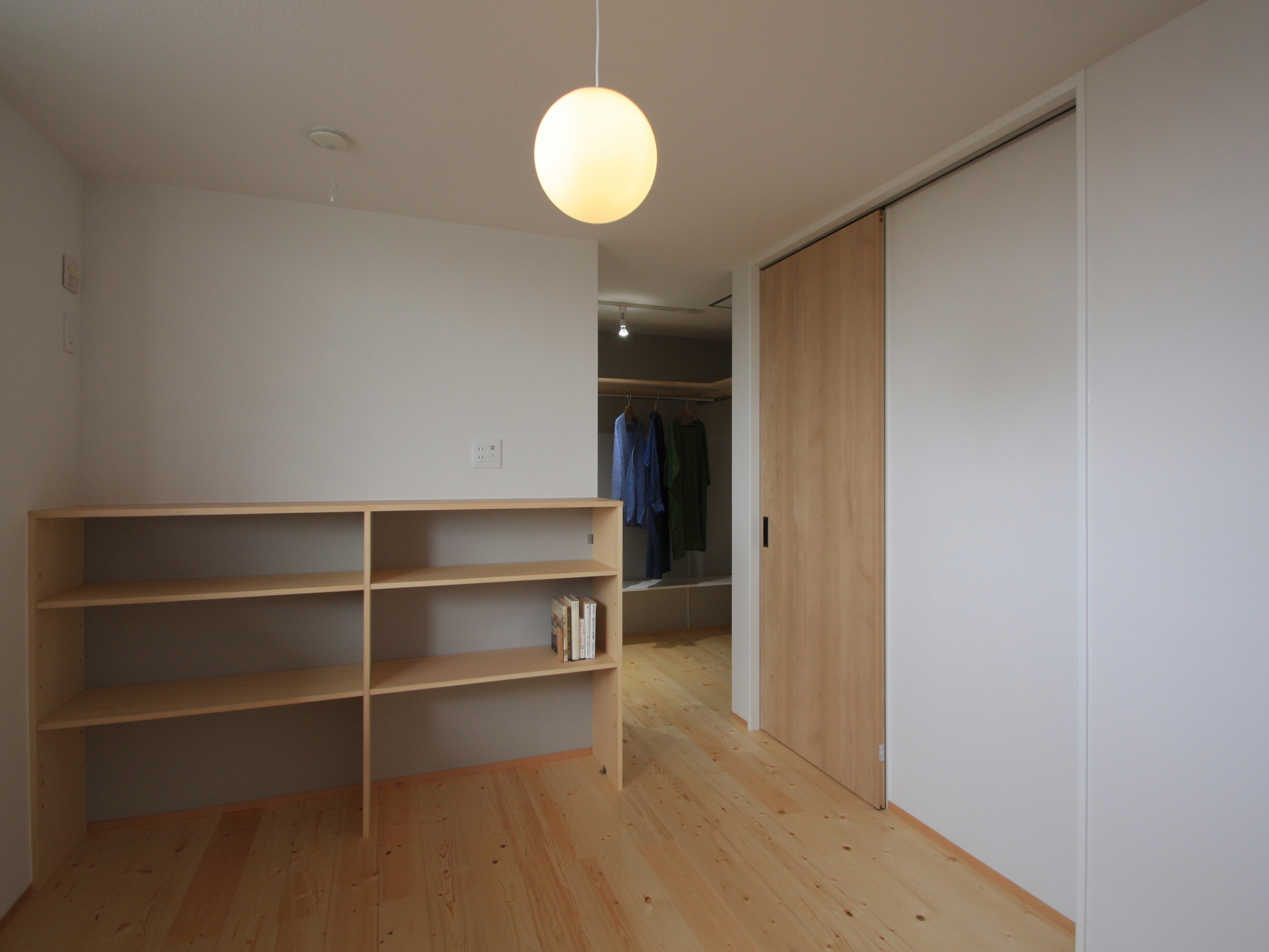 この部屋はかべの色が薄いグレー、天井もシナ合板で天井高も少し抑えて落ち着いた雰囲気です。