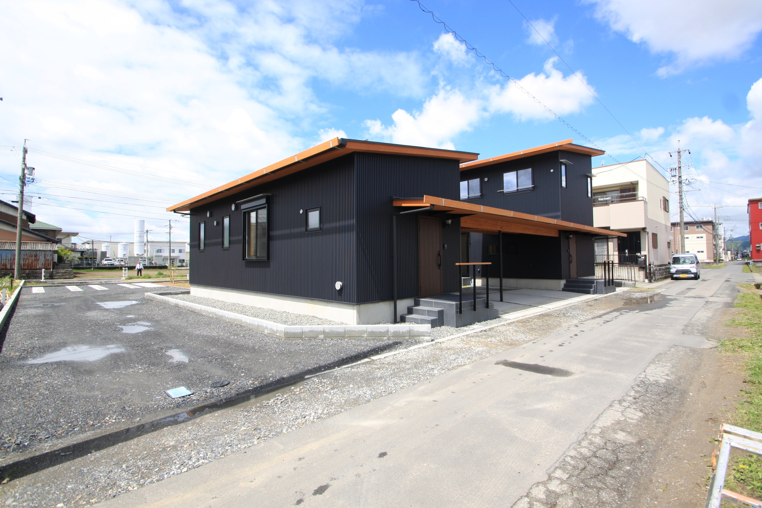 外観は黒いガルバに オレンジの樋隠しや軒裏、エムズスタイルです。