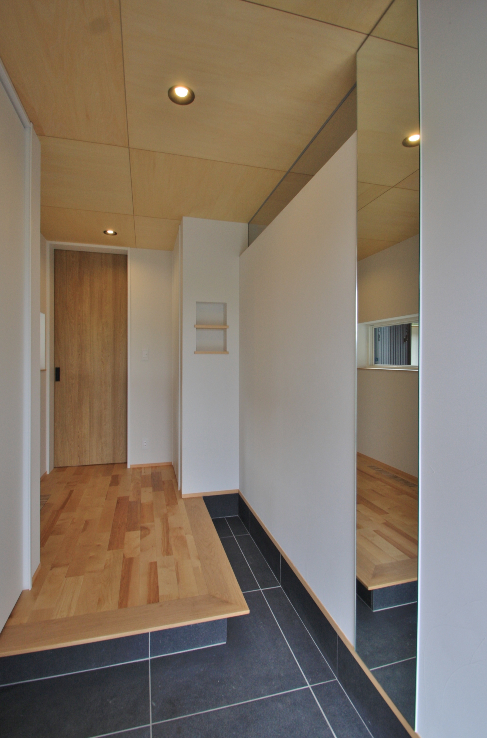 玄関土間は上がり框をL字にすることで 並んで靴の脱ぎ履きがしやすくなります。