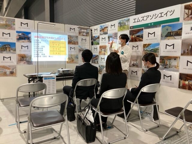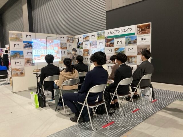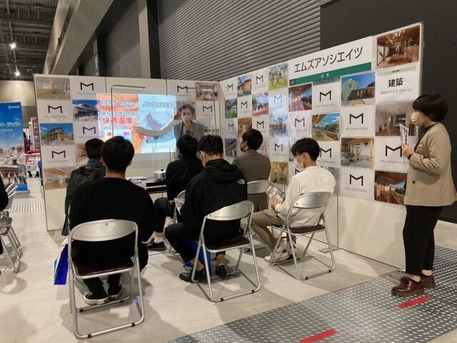 エムズOBさんお住まいの施工事例写真とエムズロゴを組み合わせた装飾で、学生の皆さんにちょっとでも立ち止まって頂けるように、頑張って飾りました!