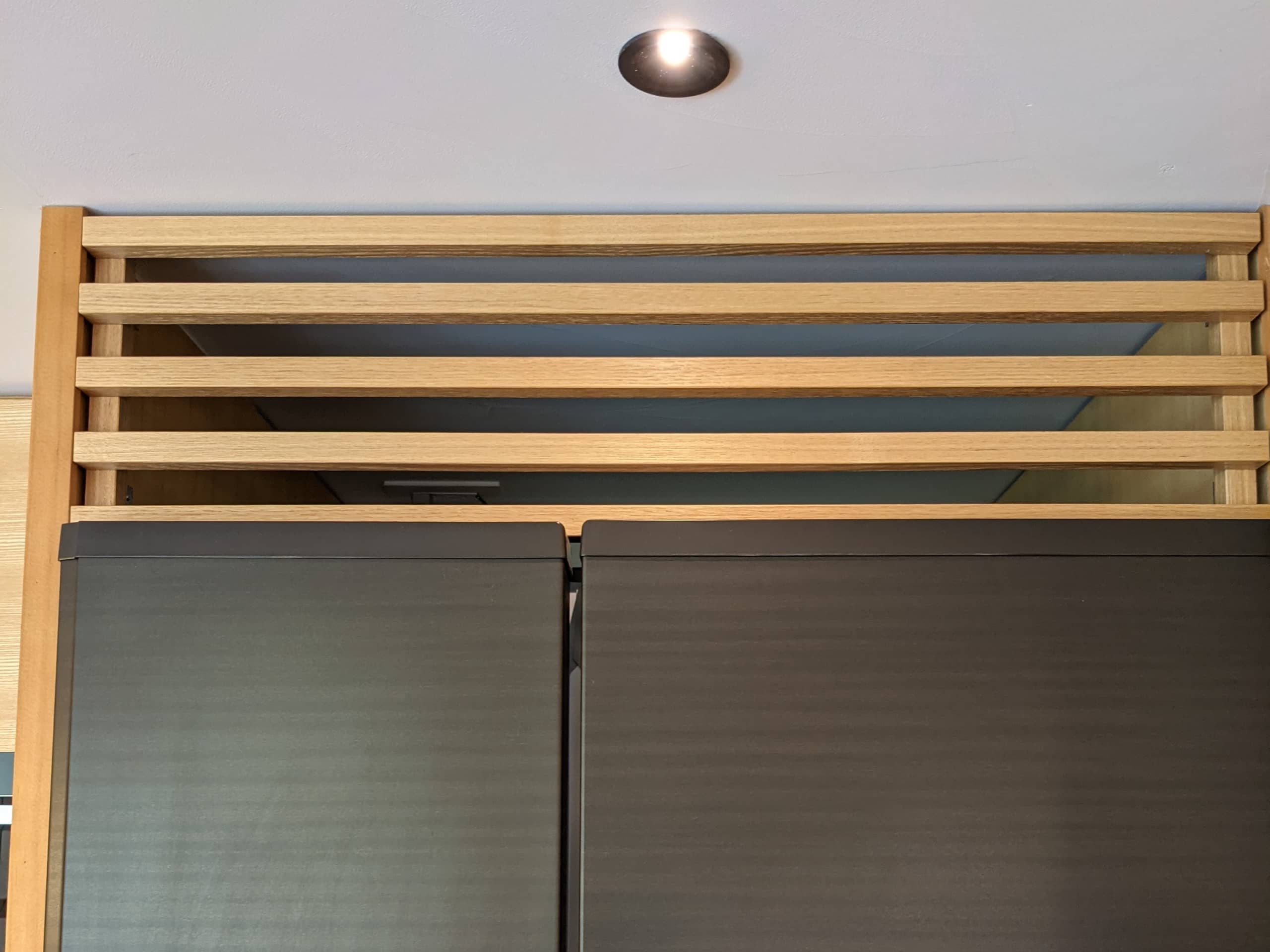 レンジフードはどうしても無機質な感じになるのですが、レンジフードの上部がサイドの棚の木材と続いていて、すっきりと柔らかい感じが好きです。