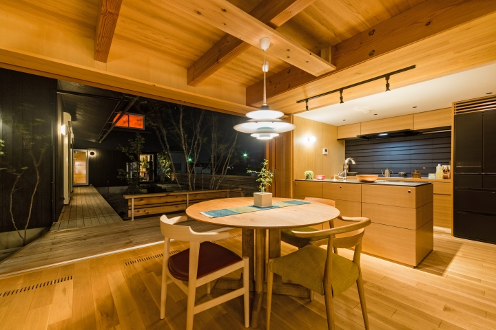 無垢材がほんのりと温もりを宿した室内で、家族の会話がゆっくりと弾む時間。