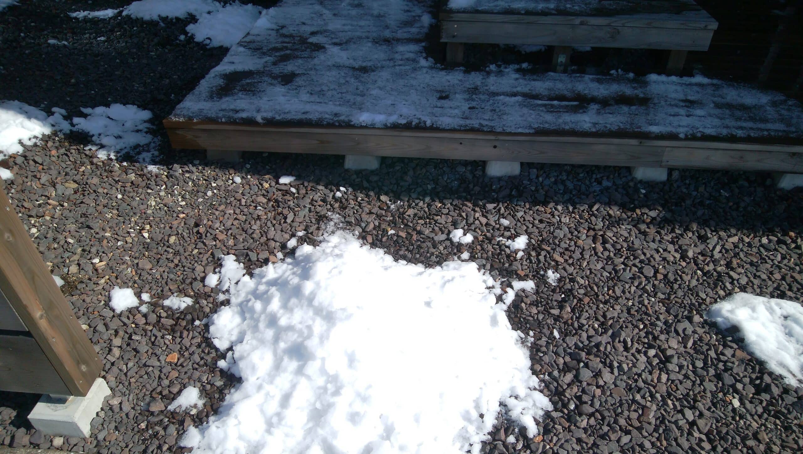 ウッドデッキ上の雪は日が当たらないのでまだ残っています。