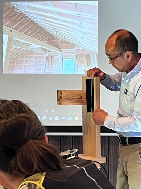 「梁がここにあって…断熱材がこちら側にあって…ここをこうしないとすき間が…」