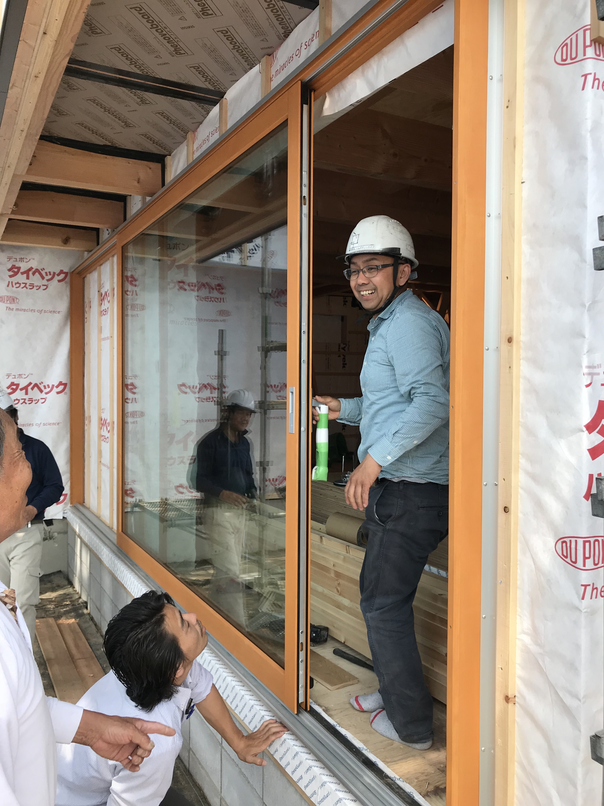 木製サッシ吊り込み完了後の、永井常務の笑顔もすがすがしく。