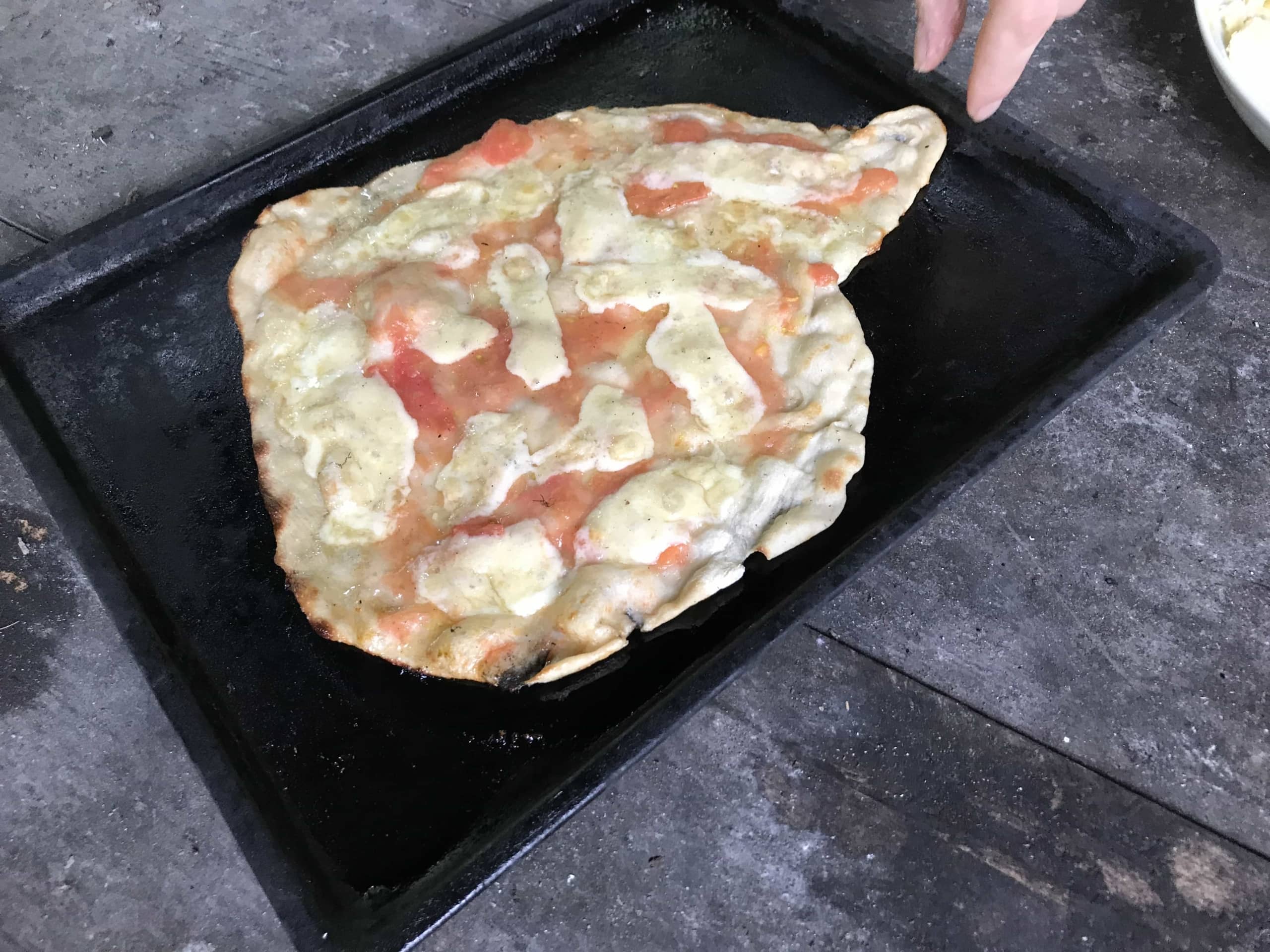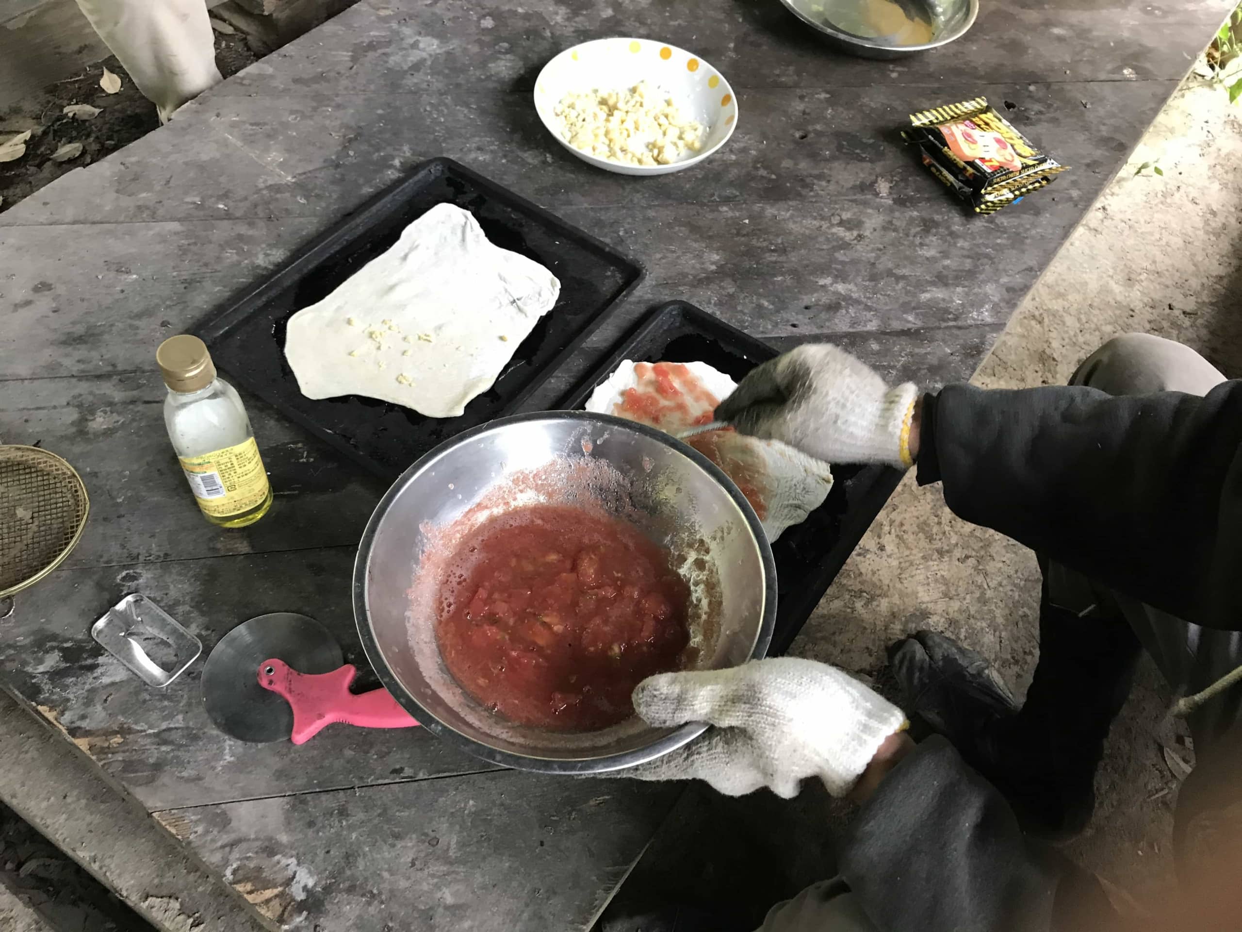 ピザソース なんてないですから、トマトをつぶして塩だけいれた、純トマトソース