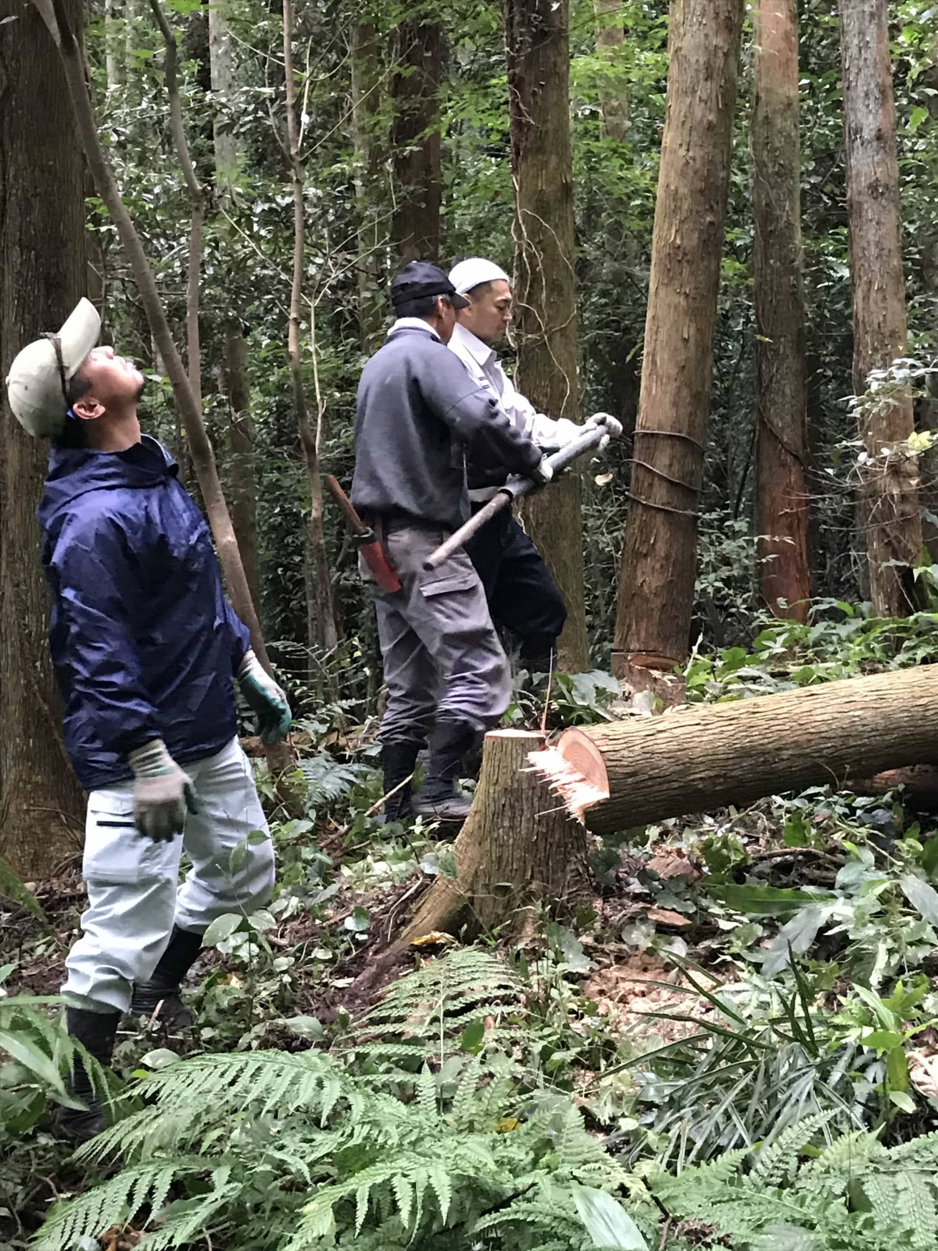 薪を確保するためと森の持続のために、杉の木を伐採しております。