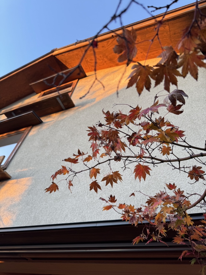 さらには夕暮れだったので、お庭の紅葉した楓とモデルハウスの塗壁が
