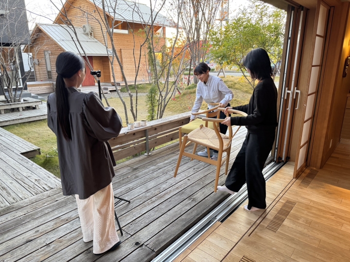 どうやらウッドデッキで撮影をするようで、椅子やコップをおしゃれに配置していました。