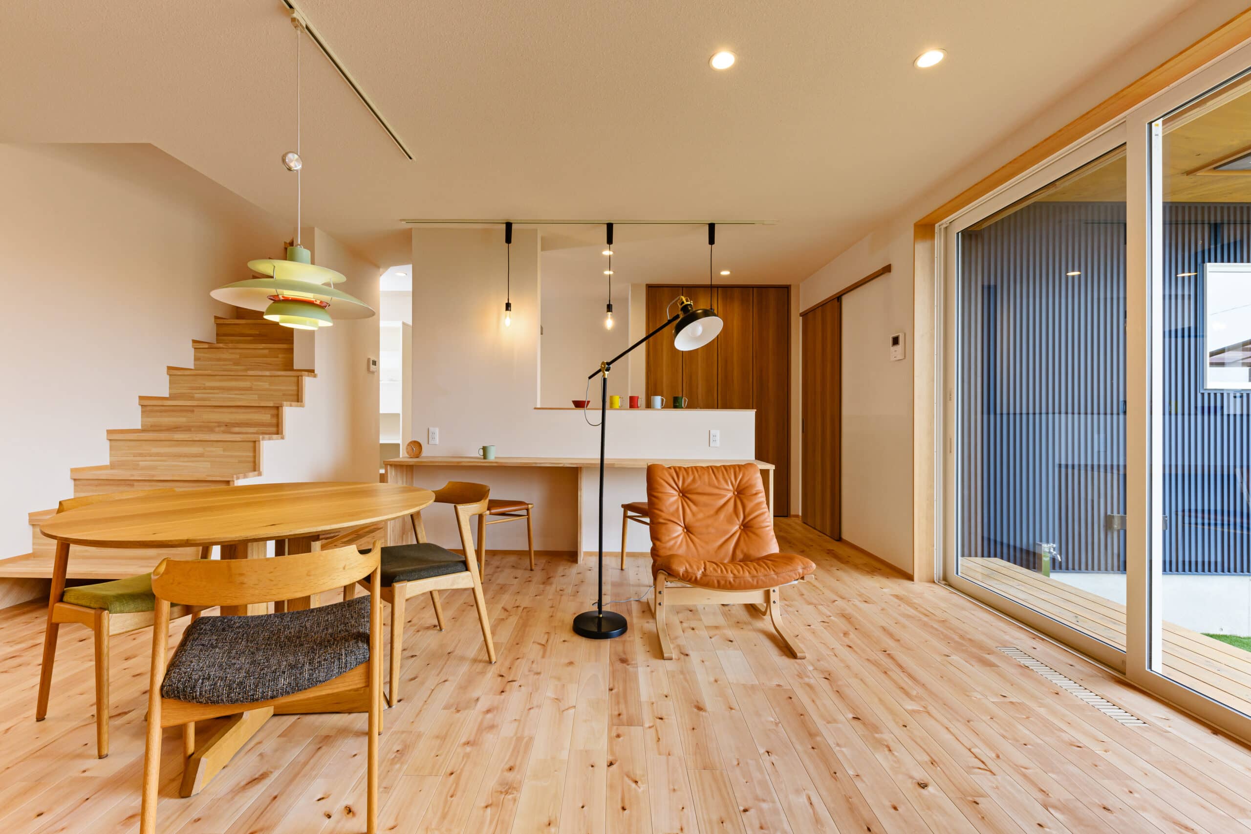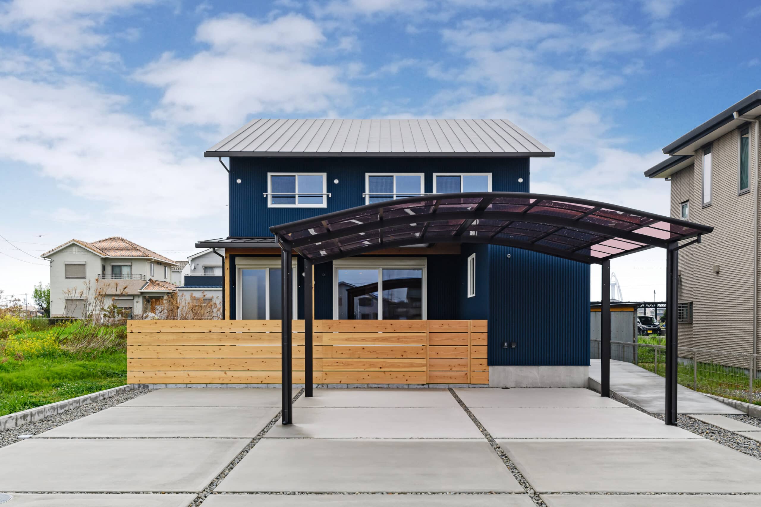 外壁はダークブルーのガルバリウムです。定番の掃き出し窓の前には下屋根もつけて夏の日射をカットしています。