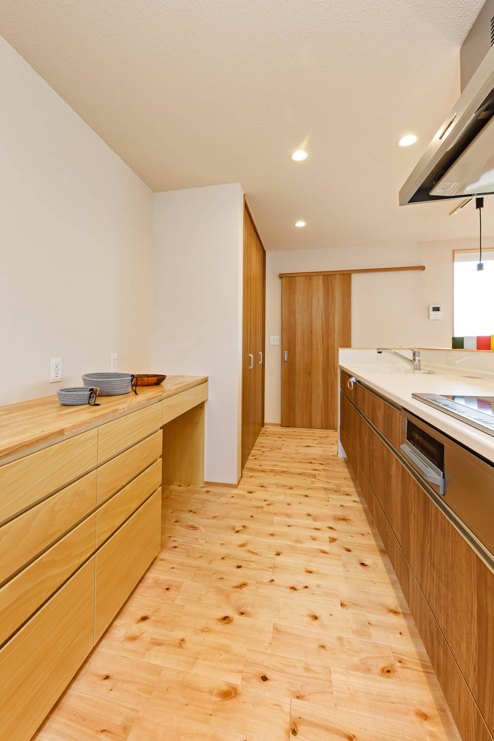 カップボードはお任せ頂いたので、シナ合板で取手もなくすっきりと仕上げました。奥の扉はパントリーとなっていて収納もたっぷりです。