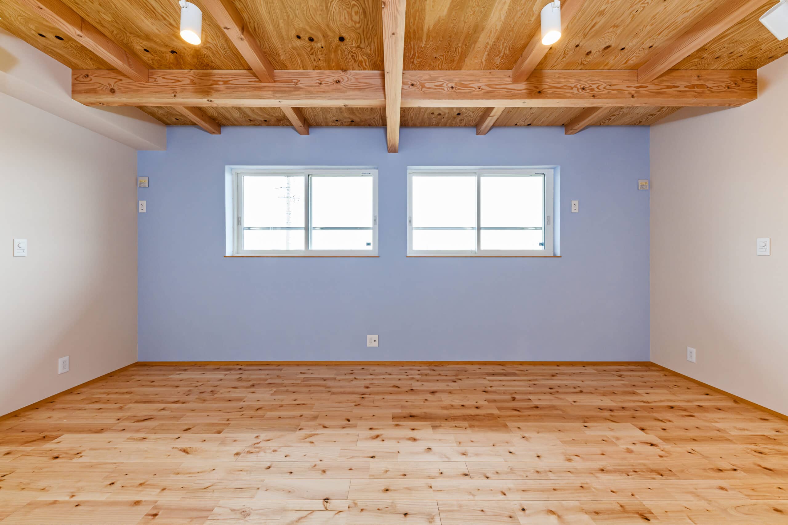 子供部屋は最初は広く使って、後から仕切れるようになっています。アクセントカラーに新色のアクアブルーを採用頂きました。