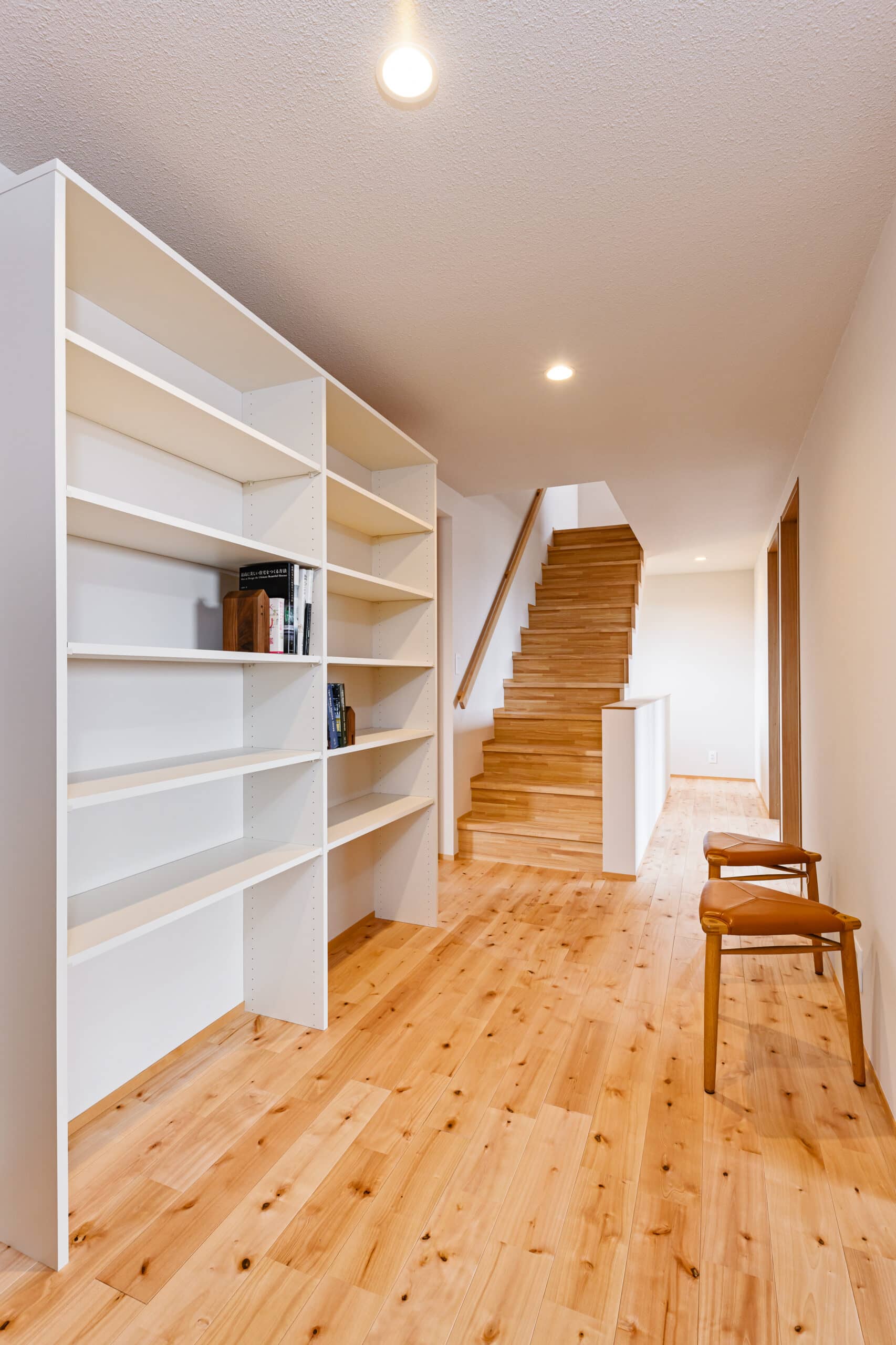 床は西南カバ(サクラ)でナチュラルな雰囲気のトーンでまとめました。階段は巾をご要望で広めにとりましたので、腰掛けたりも出来そうです。