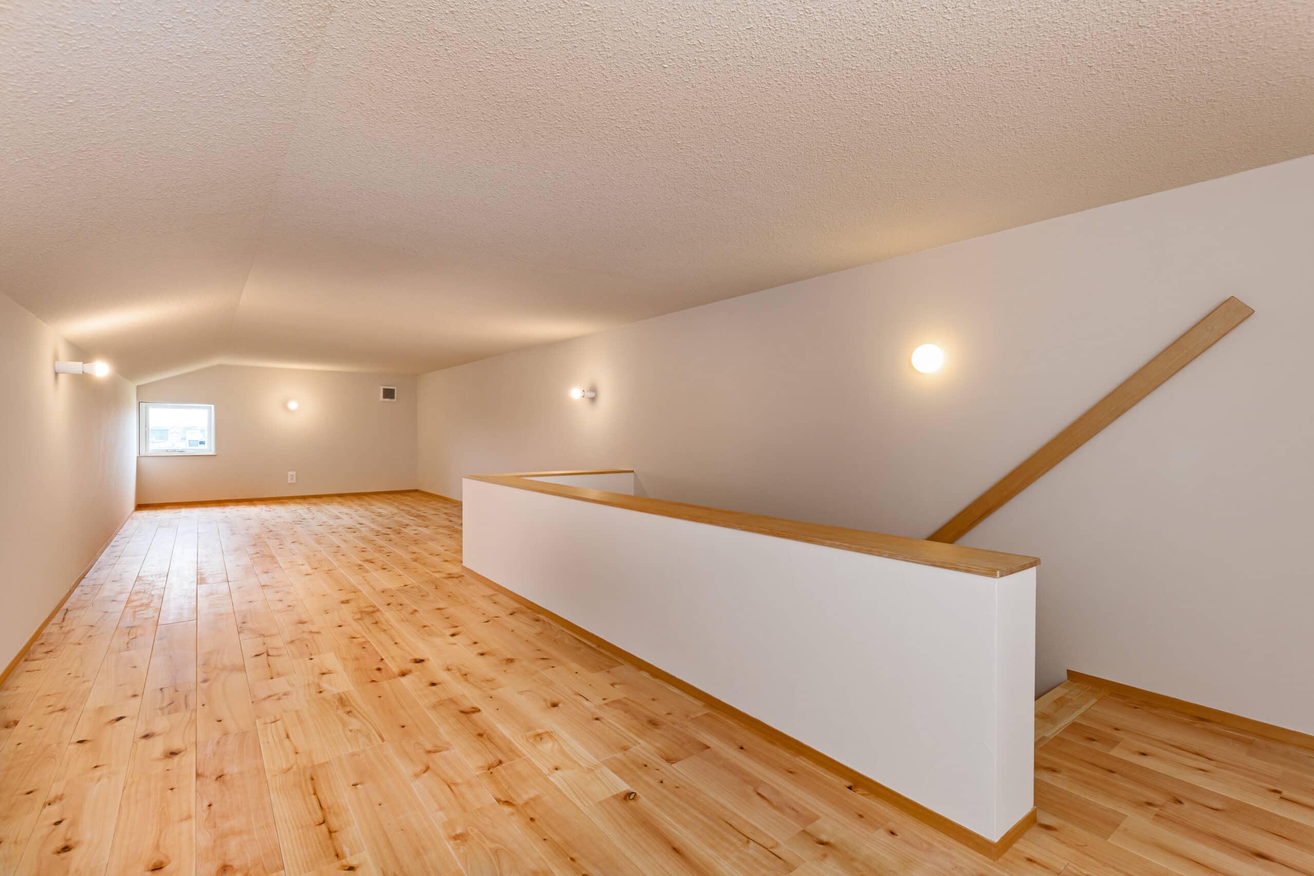 先ほどの階段に続くのは広~いロフトです。ロフトは階段で上がるのがおすすめです。ハシゴなどで上がる方法もありますが中々ハシゴで上るのはハードですからね。