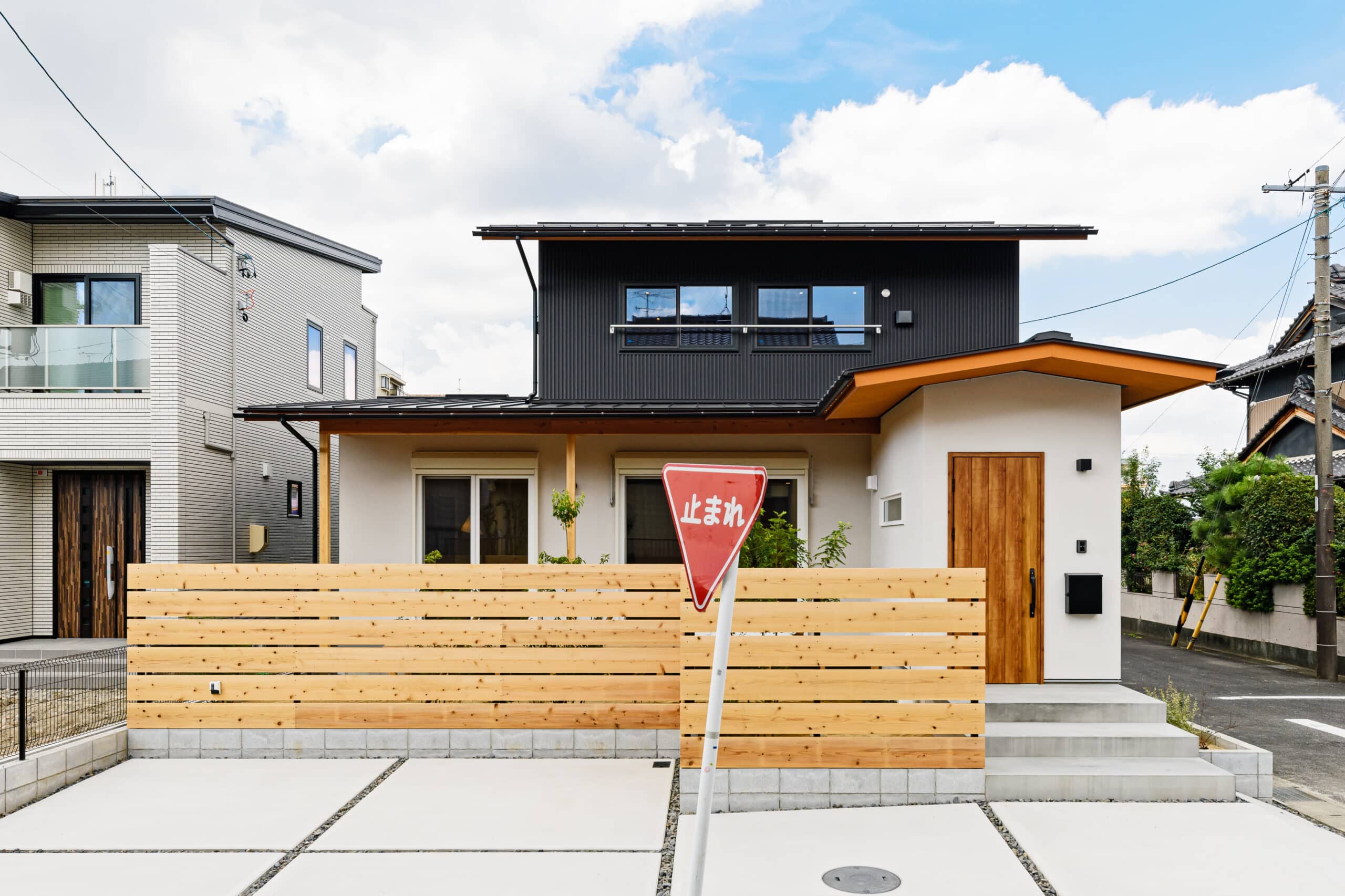 外観は1階部分が塗壁で、2階部分をガルバで仕上げています。