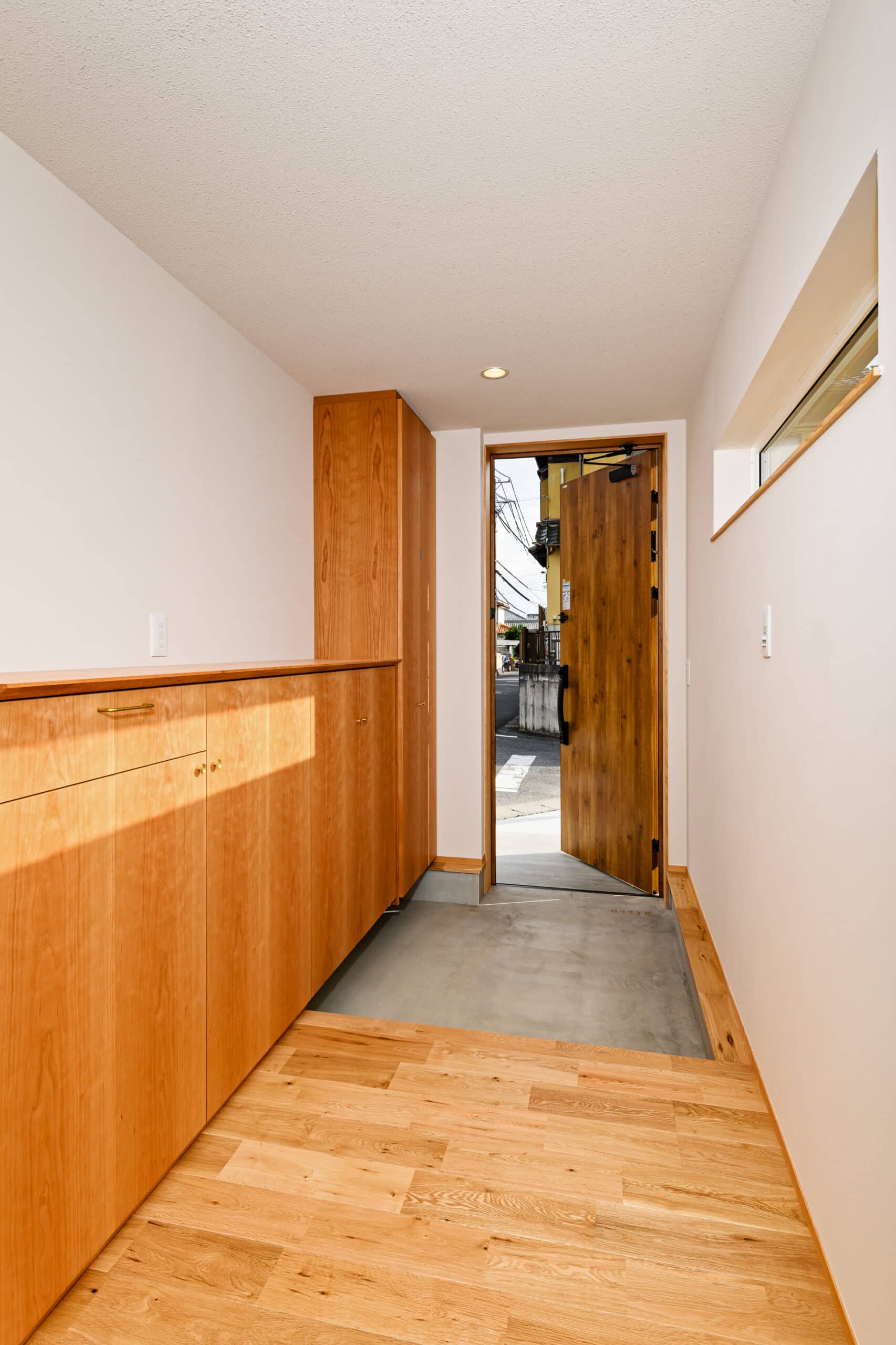 玄関収納は造作(アメリカンチェリー突板)で、コート掛けも作っています。