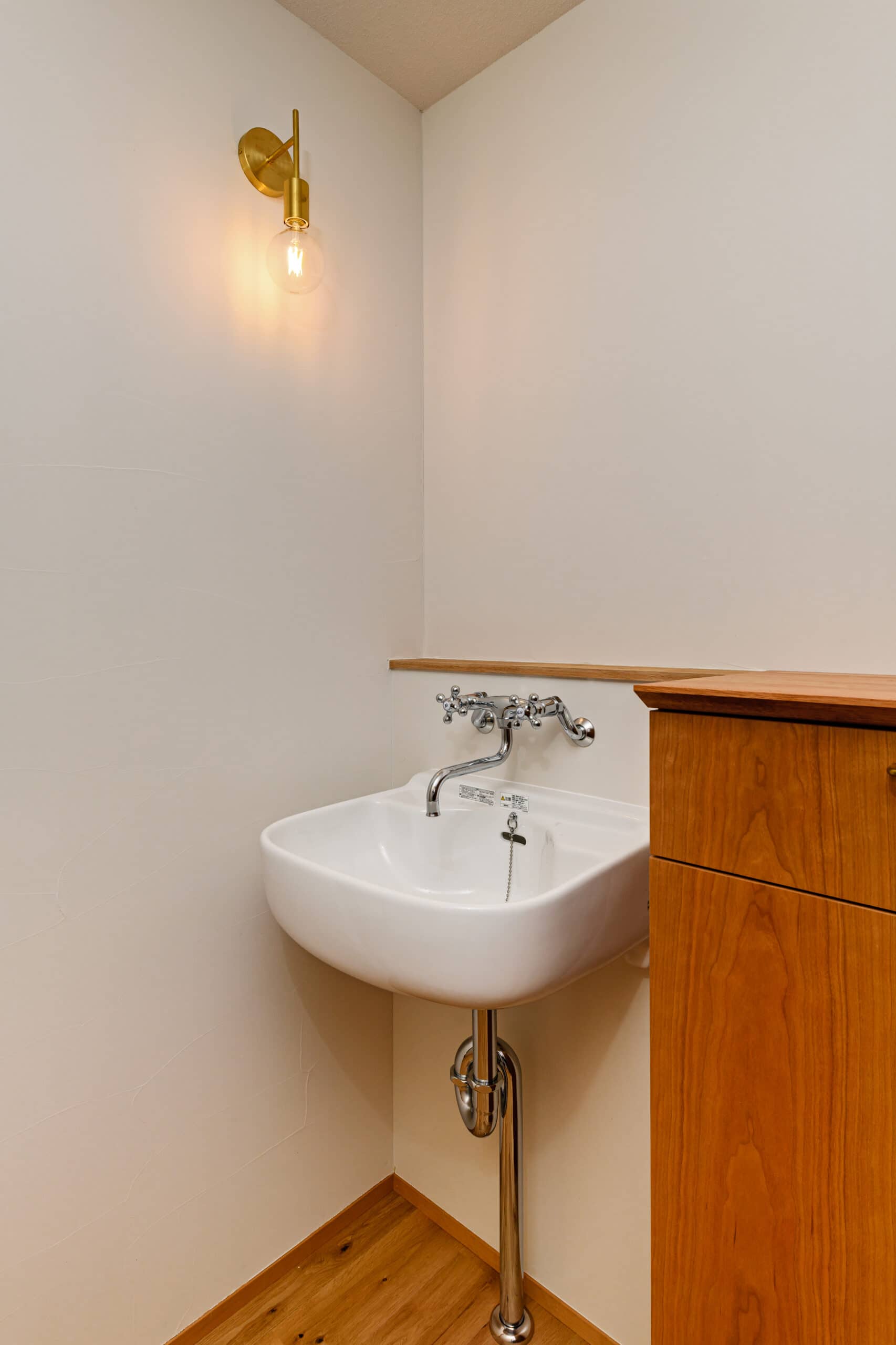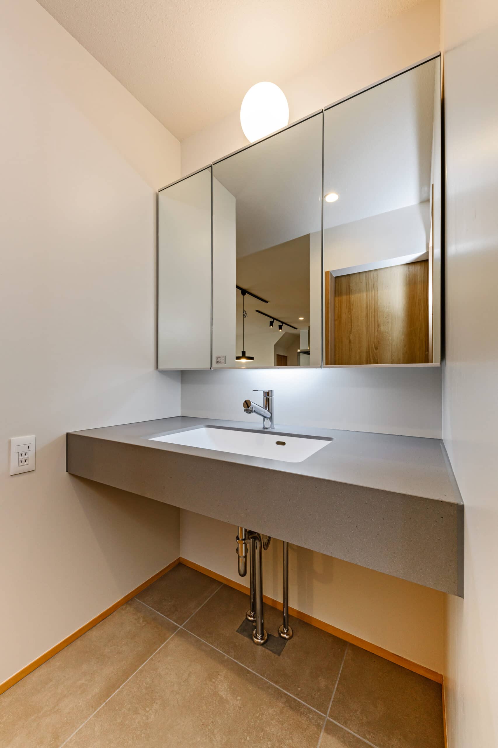 洗面化粧台は洗面脱衣室の中ではなく、LDKの空間の端の方に設けました。