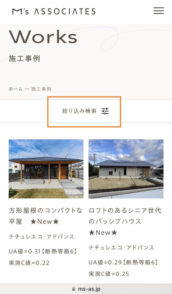 絞り込み機能は、現在表示されている断熱性能や気密性能はもちろん、階数や価格帯、デザインや坪数など、幅広い項目の中から詳細に絞り込みができるので、よりご希望の施工事例を閲覧いただきやすくなりました!