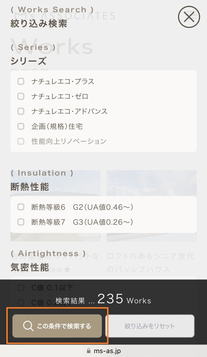 希望の項目にチェックいただき、「この条件で検索する」をタップいただくと、絞り込みをして施工事例を表示することができます✨